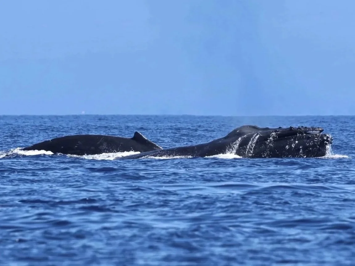 We were intrigued by one whale who had curious markings on their head - maybe an injury that has healed? Especially between the males, competition can be intense. It is the breeding season after all, and not every whale comes out unscathed.